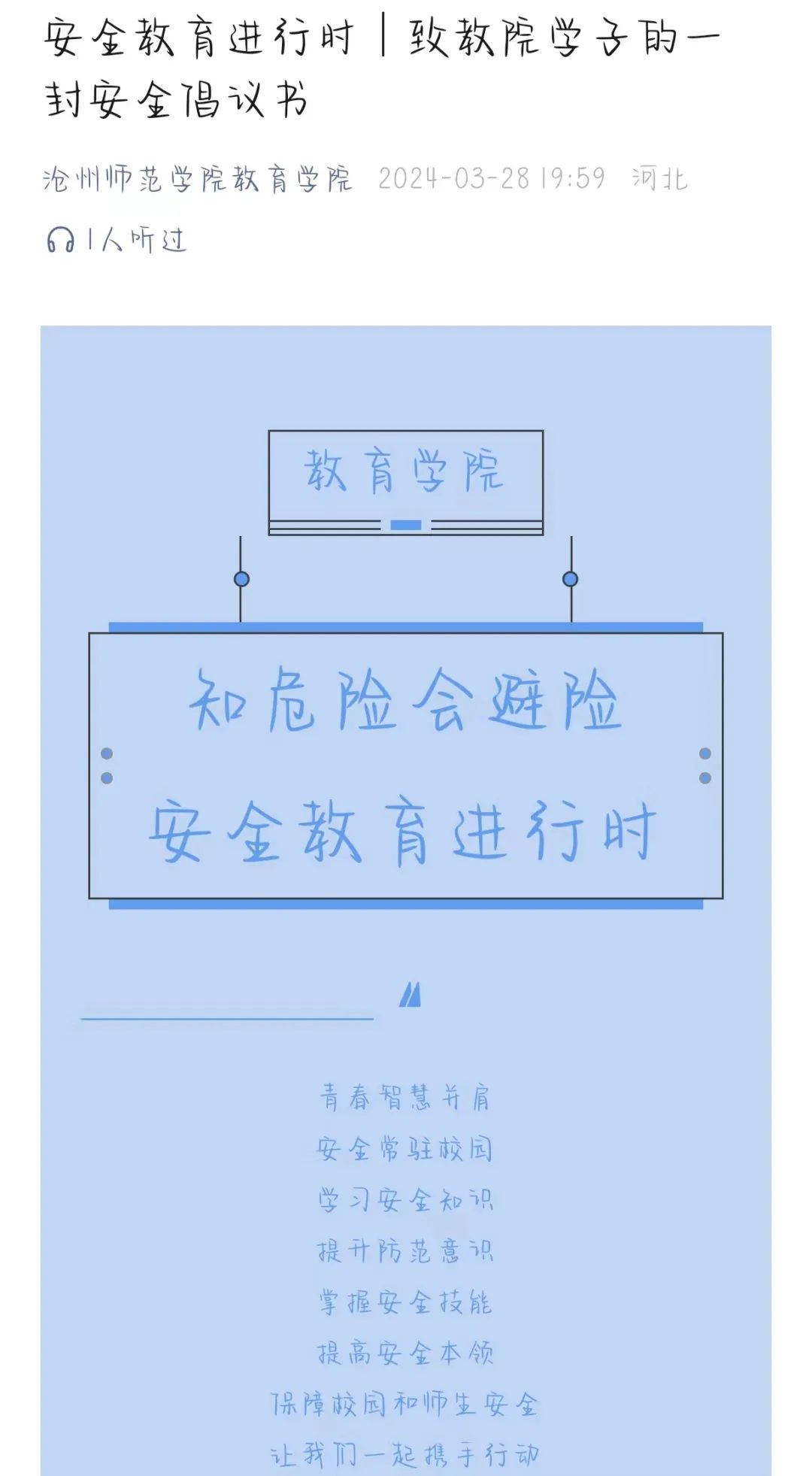 通过本次安全教育活动,该院学生纷纷表示必将安全意识铭记在心,牢记生命高于一切,安全重于泰山。