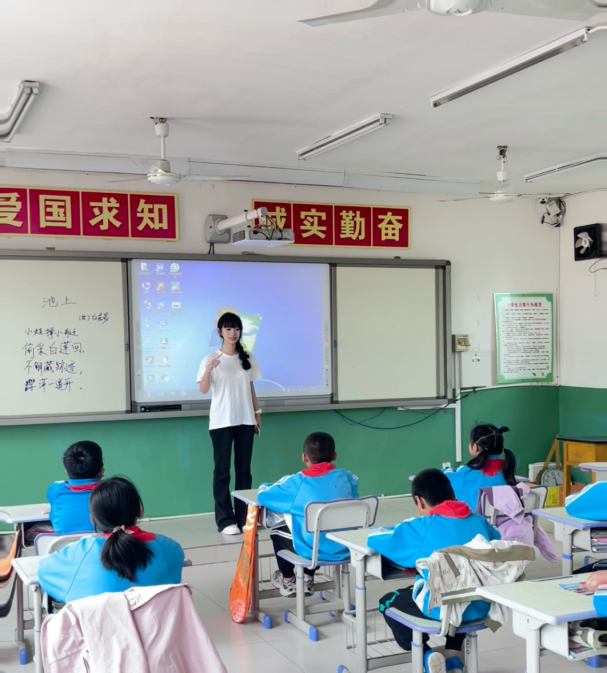 仪式结束后,雷竞技官网播音与主持艺术专业学生开启专业实践活动,全面深入实施中华经典诵读工程,用经典诗文浸润乡土,通过吐字归音、发声共鸣等理论对大王庄小学学生进行普通话字音纠正与朗诵指导,“小娃撑小艇,偷采白莲回。不解藏踪迹, 浮萍一道开”……欢乐嘹亮的诵读声在宁静的校园里久久回荡。