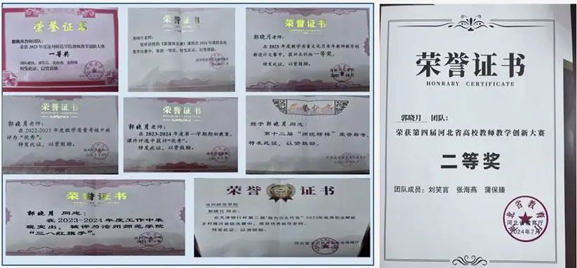 创新产教融合教学模式,让教师转换角色,成为“企业主管”,成为 “项目经理”,教师通过与企业导师沟通,指导学生,让学生成为学习的中心和主体,在教学理念上实现了真正的内化于心,外化于行。所依托专业顺利通过省级一流本科建设合格验收。团队成员多人获得实践技能大赛优秀指导教师奖,课程负责人郭晓月多次被新闻媒体报道,获沧州市优秀青年教师称号、师院榜样、记功、三八红旗手、教学考核优秀、师德优秀等荣誉,教学团队获河北省第四届教学创新大赛二等奖、校级优秀教学团队、校级教学创新大赛一等奖、青年教师课堂教学设计大赛一等奖、课程思政教学比赛一等奖等。
