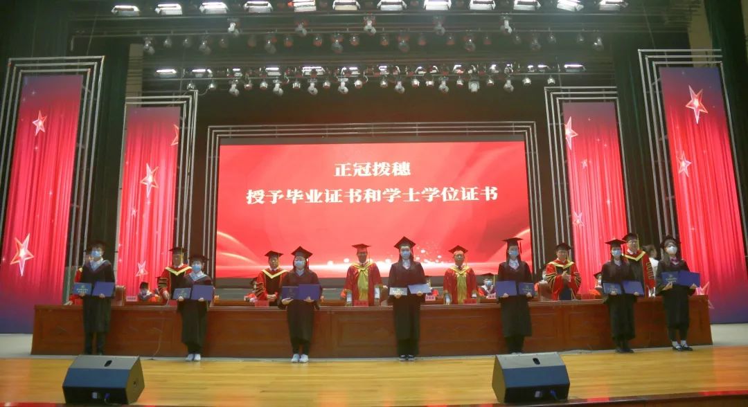 校领导为毕业生代表拨穗正冠,亲授证书,毕业生代表将鲜花献给领导老师,心怀感恩与不舍,为自己的学业生涯画上一个时期的终止符。