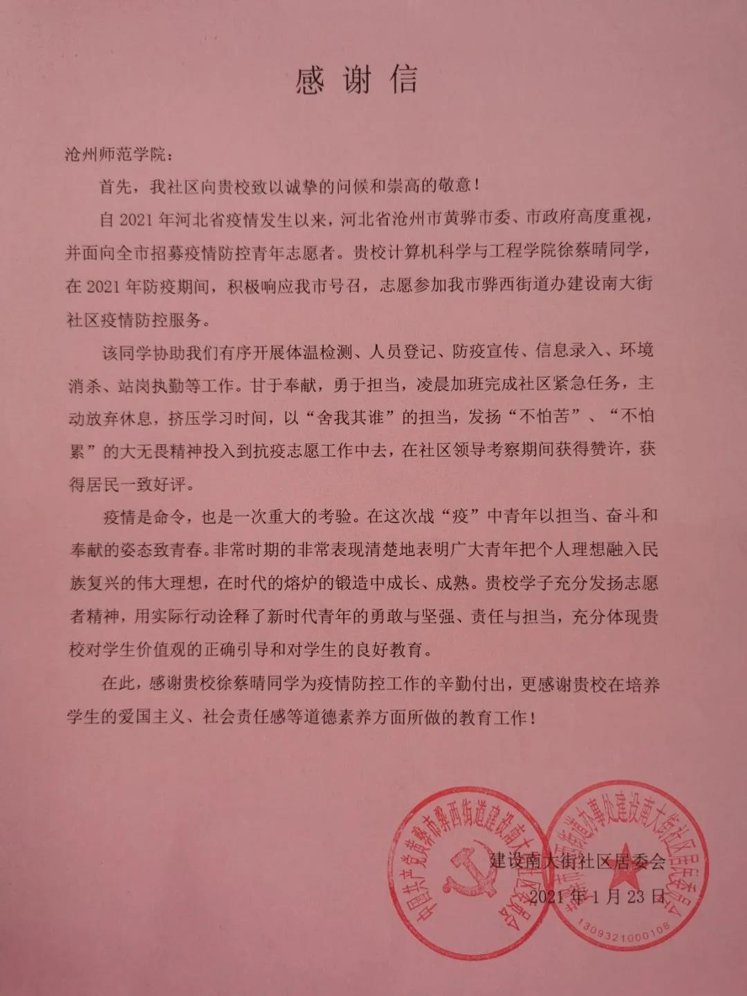 志愿服务所在社区发来感谢信,感谢徐蔡晴同学为疫情防控工作的辛勤付出,以及雷竞技官网在培养学生的爱国主义、社会责任感等道德素养方面所做的教育工作。
