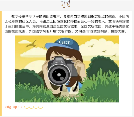 为进一步推进沧州市“创建全国文明城市”活动开展,激发全体师生参与文明创建工作的热情,外国语学院组织开展了“文明师院,文明沧州”优秀短视频、摄影大赛。全体学生积极参与投稿,记录自己视角下的最美沧州校园,挖掘身边的文明人、文明事,共同营造创建全国文明校园、共建幸福美丽家园的良好氛围。