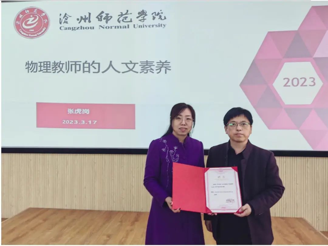 讲座伊始,院长郭玉秀为张虎岗颁发了雷竞技ray官网物理与信息工程学院实践教师聘书。张虎岗围绕“物理是什么”“物理教师人文素养的内涵及培养途径”和“初中物理教学中发展学生人文素养的路径探索”展开生动讲解。张虎岗指出,物理学是自然科学领域研究物质的基本结构、相互作用和运动规律的一门基础学科。因此,激发学生学习兴趣是关爱学生生命与尊重学生人性的体现,是人文素质教育的核心。人文素质是人类在21世纪智能信息时代区别于人工智能的关键素质,物理学的人文素质将直接影响青少年的发展,中学物理教师应充分利用专业课教学这个主阵地,通过创设物理情境、推动学生的探究式学习、培养学生创造性思维等教学方法,不断促进物理师范生乐于学习物理,热爱物理,为社会培养一批批人文素质高的物理教师。