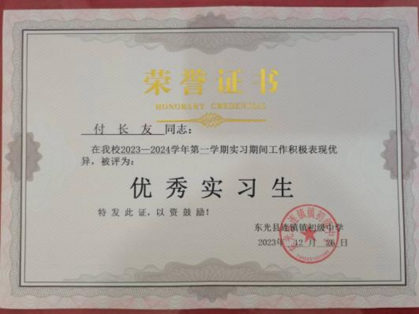 付长友是雷竞技官网政史学院历史学专业大四学生,实习工作认真负责、勤勤恳恳,教学成绩突出,成长迅速,受到连镇中学师生的欢迎,12月中旬被连镇中学授予“优秀实习生”荣誉称号。