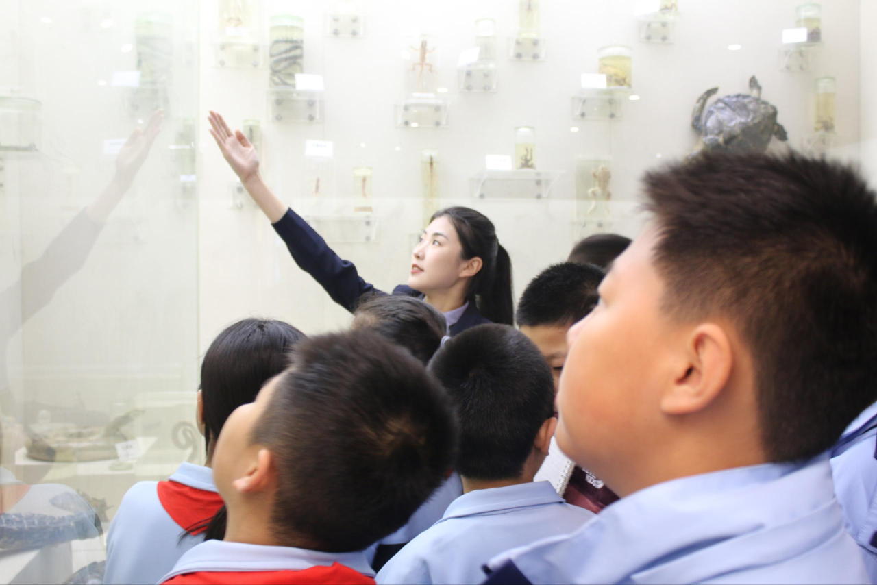 来到生物标本馆,学生们立即被馆藏的丰富多彩栩栩如生的动植物标本所吸引,在科普志愿者的带领下,学生们依次参观了大鸨区、无脊椎动物区、两栖类、爬行类、哺乳类和鸟类、植物等展区。在大鸨区有的标本振翅欲飞、有的标本威严伫立,鸟类区千姿百态的鸟伫立枝头争奇斗艳,昆虫区蝴蝶标本似翩翩起舞,哺乳区有的动物雄壮威武、有的机智灵动,植物展区有的果实累累、有的生机勃勃。生科院的科普志愿者向学生详细的介绍了各种动植物的主要形态特征、生活环境、生活习性和繁衍特点,展示了华北地区特别是沧州地区丰富的动植物资源,传播了环保意识和绿色发展理念,激发了小学生对生命科学的热爱和探索欲望,激发了小学生热爱家乡、热爱祖国的家国情怀,增强了小学生学好本领建设沧州报效祖国的志气。