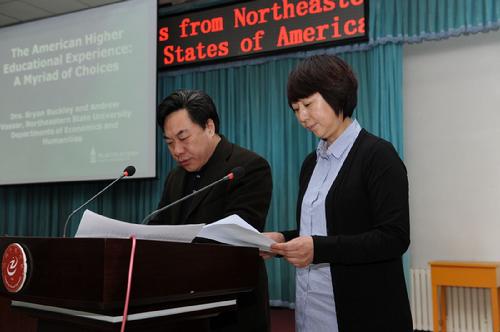 在讲座中,布莱恩·巴克特和安德鲁·瓦萨尔教授介绍了就美国东北州立大学的学校建设、教学理念,并解答了师生的问题。