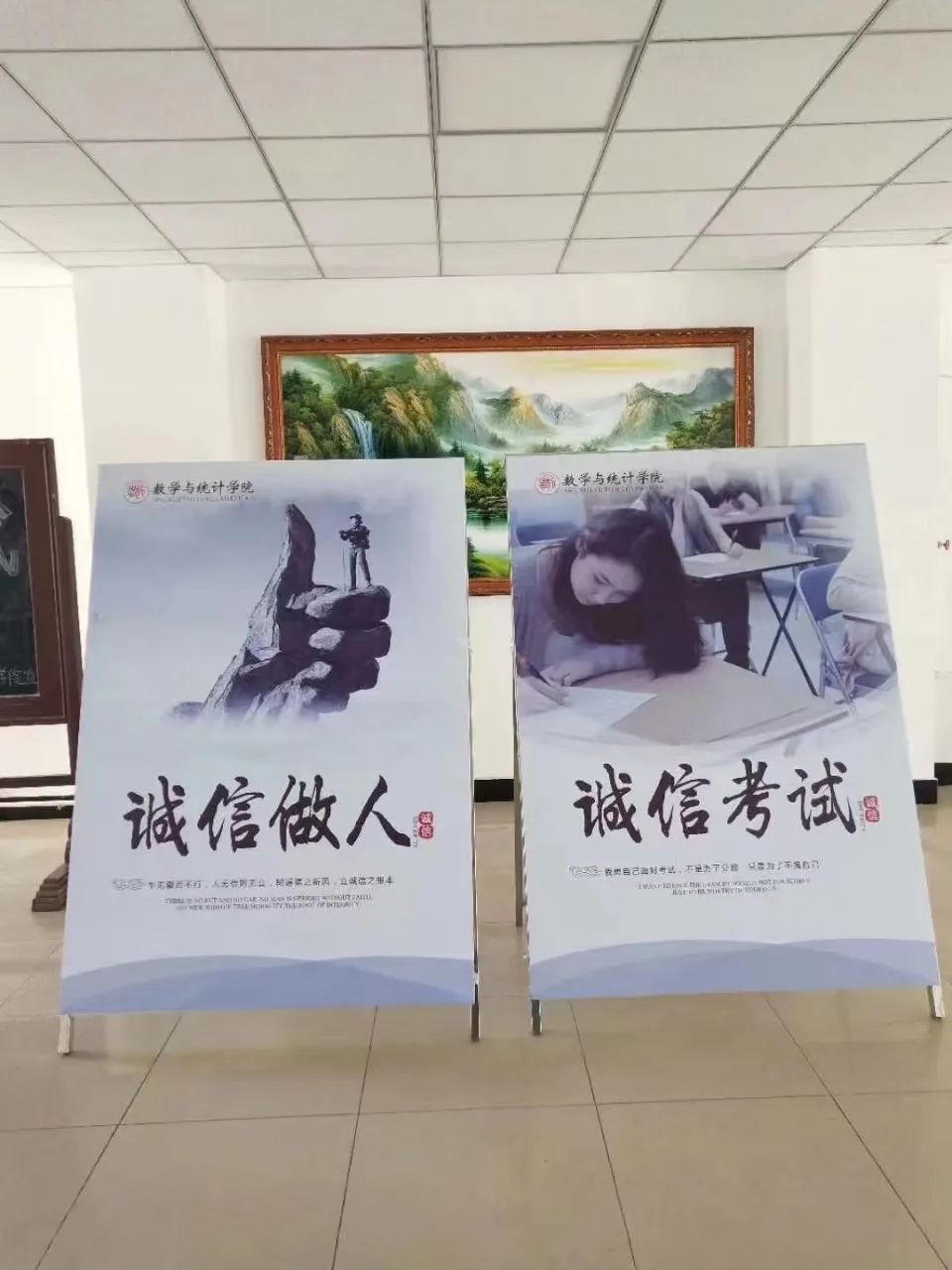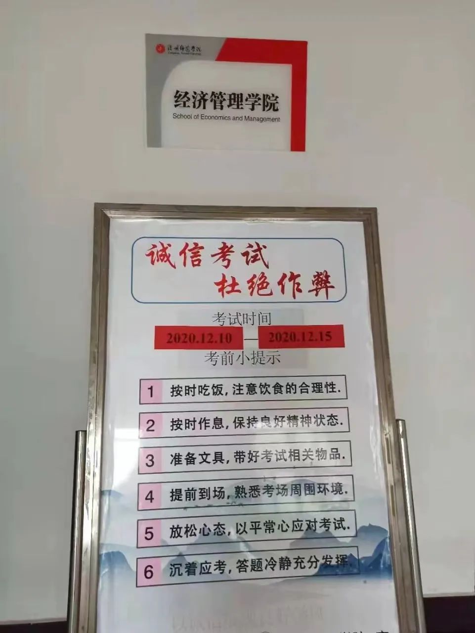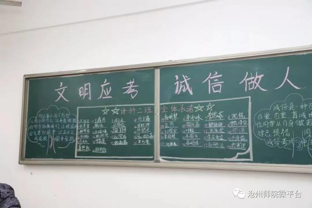 车无辕不行,人无信不立。雷竞技官网历来重视诚信教育,每学期期末考试来临之际,为增强学生诚实守信意识,严肃考风考纪,各学院领导班子群策群力,通过液晶显示屏滚动播放考试宣传标语、展示牌公布学校巡视安排、诚信考试警句和设置诚信考试主题板报等多种形式开展诚信考试宣传,每个班也举行“诚信应考”主题班会,宣传诚信应考,深化诚信教育。