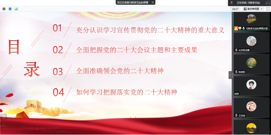 为进一步学习贯彻落实党的二十大精神,教育引导全体教师在学思践悟、学以致用中坚定信仰、提高认识、增强能力,努力把大会精神转化为做好新时代工作的强大动力,12月4日,办公室党支部和化学与化工学院党总支联合开展了党的二十大精神宣讲学习活动,马克思主义学院李艺欣副教授主讲,化学与化工学院党总支书记陈树旺主持。