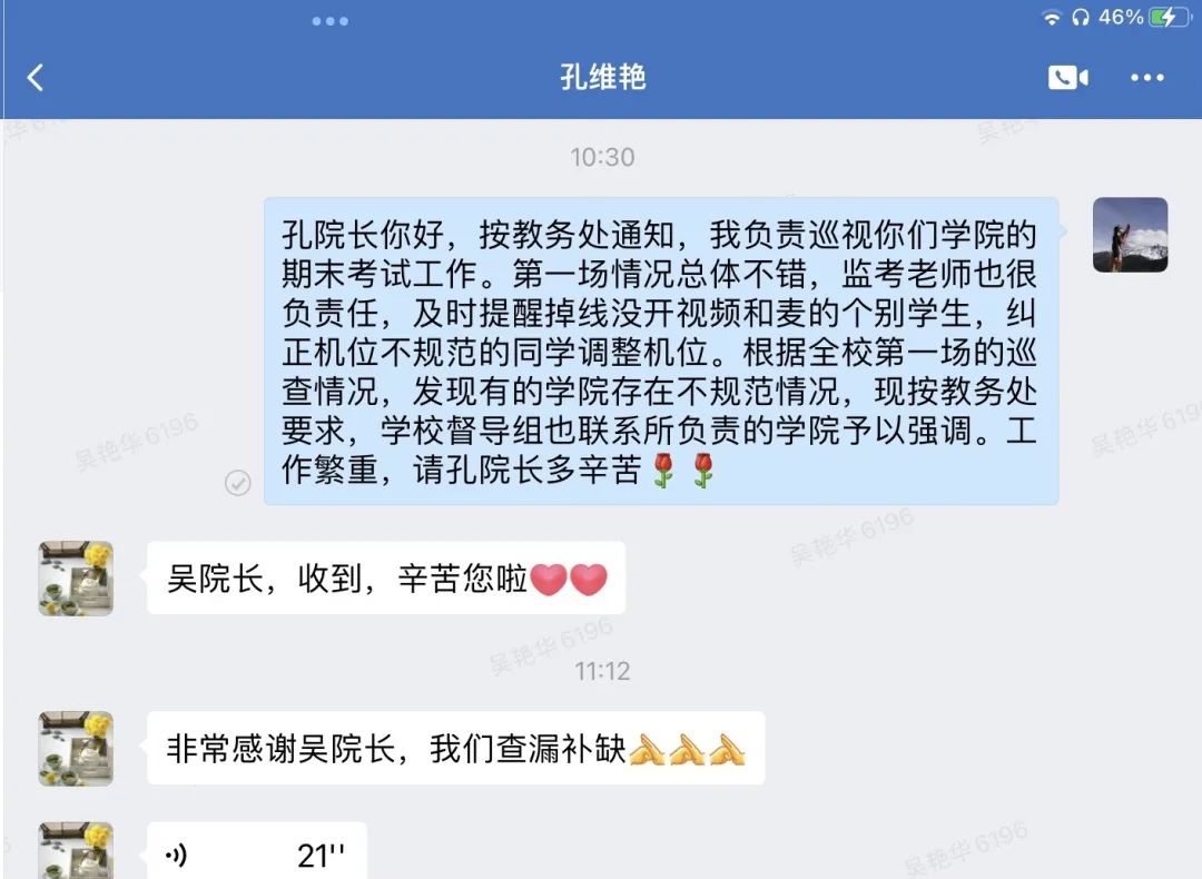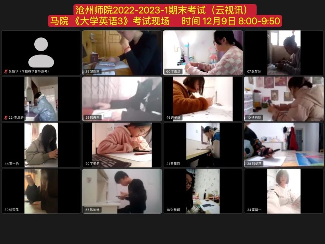 12月9日,雷竞技官网2022-2023学年第一学期线上期末考试圆满结束。在副校长范小振带领下,由学校、各学院组织的两级督导巡视队伍通过学习通后台和云视讯会议号对考试全程进行监督检查,发现问题及时反馈各考场,警示相关考生,立行纠正,教学质量保障队伍发挥了良好作用。