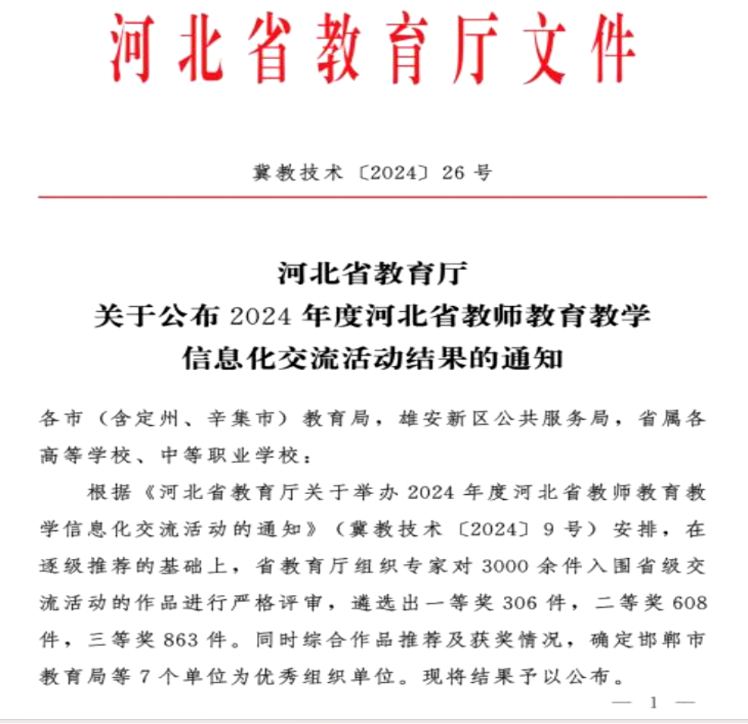 近日,河北省教育厅发布了《河北省教育厅关于公布2024年度河北省教师教育教学信息化交流活动结果的通知》(冀教技术〔2024〕26号),雷竞技官网参赛作品经过专家评审和教育厅审核取得喜人成绩,共获奖14项,其中高等教育微课一等奖4项,二等奖5项,三等奖3项;高等教育信息化教学课程案例一等奖1项,二等奖1项。同时,获得一等奖的5项作品被省教育厅推荐参加国赛。