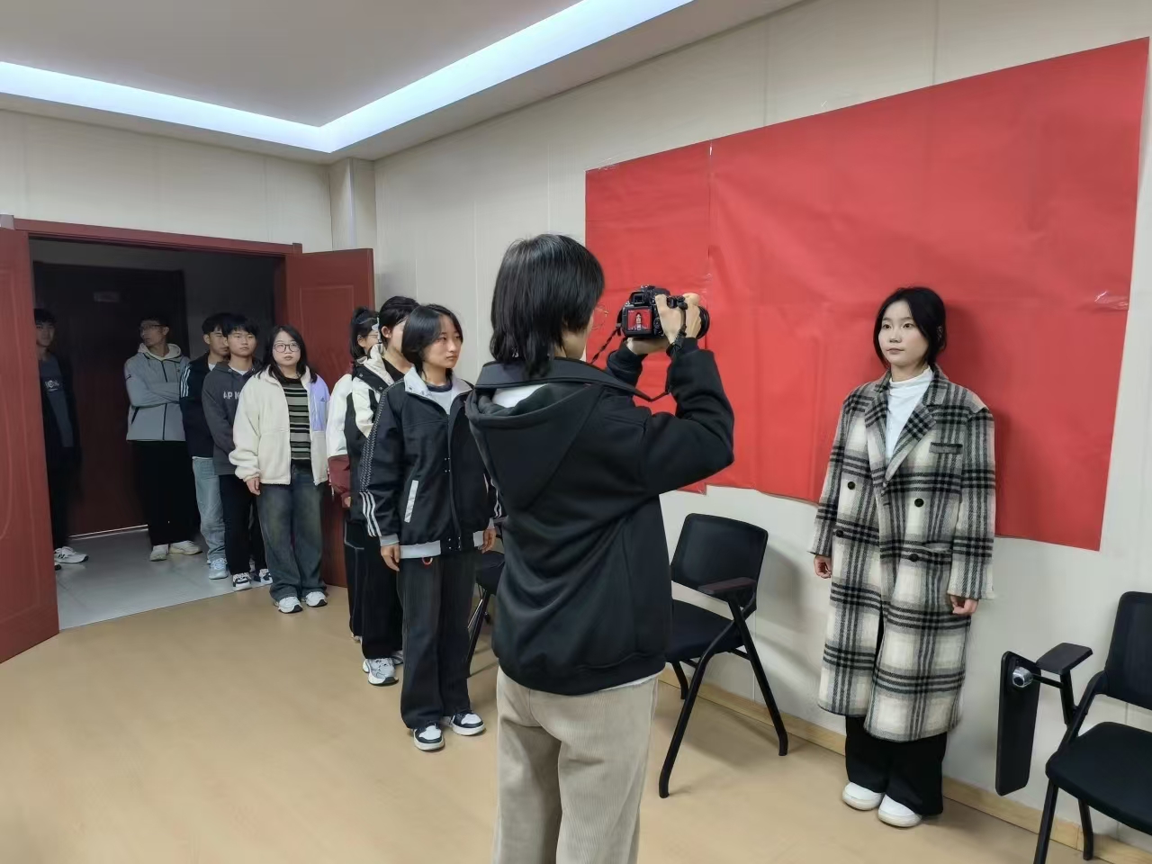 拍摄现场,精心布置的拍摄区域成为了一道靓丽的风景线。学生们按照预约时间陆续前来。志愿者们分工合作,每个环节都耐心服务。学生志愿者携带相机、三脚架、幕布等专业拍摄工具,分工明确,耐心细致地为每一位同学调整姿势、挑选背景,力求拍摄出最满意的证件照片。
