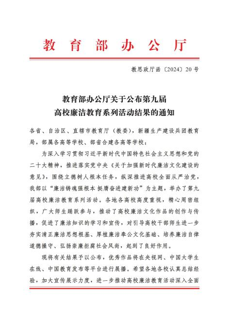 学校党委高度重视廉洁教育,把加强新时代廉洁文化建设作为学习宣传贯彻党的二十大和党的二十届二中、三中全会精神,贯彻落实中共中央办公厅《关于加强新时代廉洁文化建设的意见》的重要举措,坚持把廉洁文化建设作为基础性工程,扎实开展清廉学校建设,持续夯实清正廉洁思想根基、厚植廉洁奉公文化基础、培养廉洁自律道德操守、弘扬崇廉拒腐社会风尚,坚定不移推进全面从严治党向纵深发展,营造风清气正的政治生态和育人环境。
