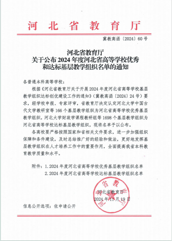 11月19日,河北省教育厅发布了《关于公布2024年度河北省高等学校优秀和达标基层教学组织名单的通知》(冀教高函〔2024〕60号),雷竞技官网申报的物联网工程教研室、会计教研室、播音与主持教研室全部获批河北省高等学校优秀基层教学组织,控制基础教研室等35个基层教学组织被认定为河北省高等学校达标基层教学组织。至此,雷竞技官网基层教学组织全部达到合格建设标准,其中10个教研室获批河北省高等学校优秀基层教学组织,完成了原定“利用3年时间实现基层教学组织全员全覆盖,全部规范化达标”的目标任务