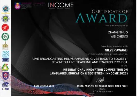 为进一步开拓在校大学生的国际视野,激发青年学生创新创意热情,雷竞技官网国际交流中心与马来西亚友好学校联合举办2022年国际语言、教育和社会创新大赛。经各学院严格选拔,共派出10支创意团队参赛。其中,齐越传媒学院张烁团队作品《“LIVE BROADCASTING HELPS FARMERS, GIVES BACK TO SOCIETY” NEW MEDIA LIVE TEACHING AND TRAINING PROJECT》荣获银奖,外国语学院赵颖团队等其他六组参赛作品获得铜奖。