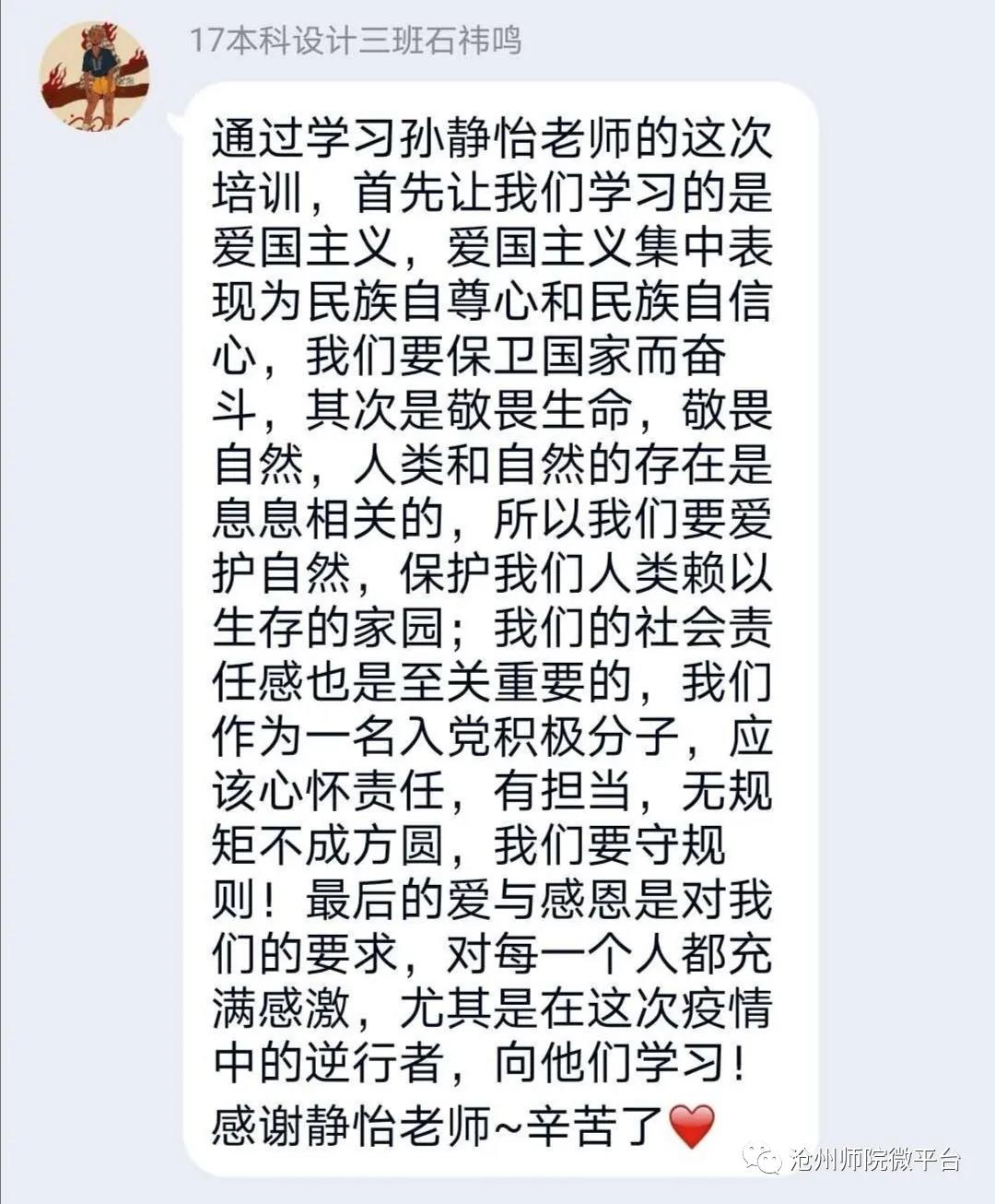 培训结束后,同学们依然热情高涨,纷纷在QQ群里发表了自己对此次培训的感想,表达了对疫情早日结束的期盼和对疫情期间所有付出的人们的最高敬意。
