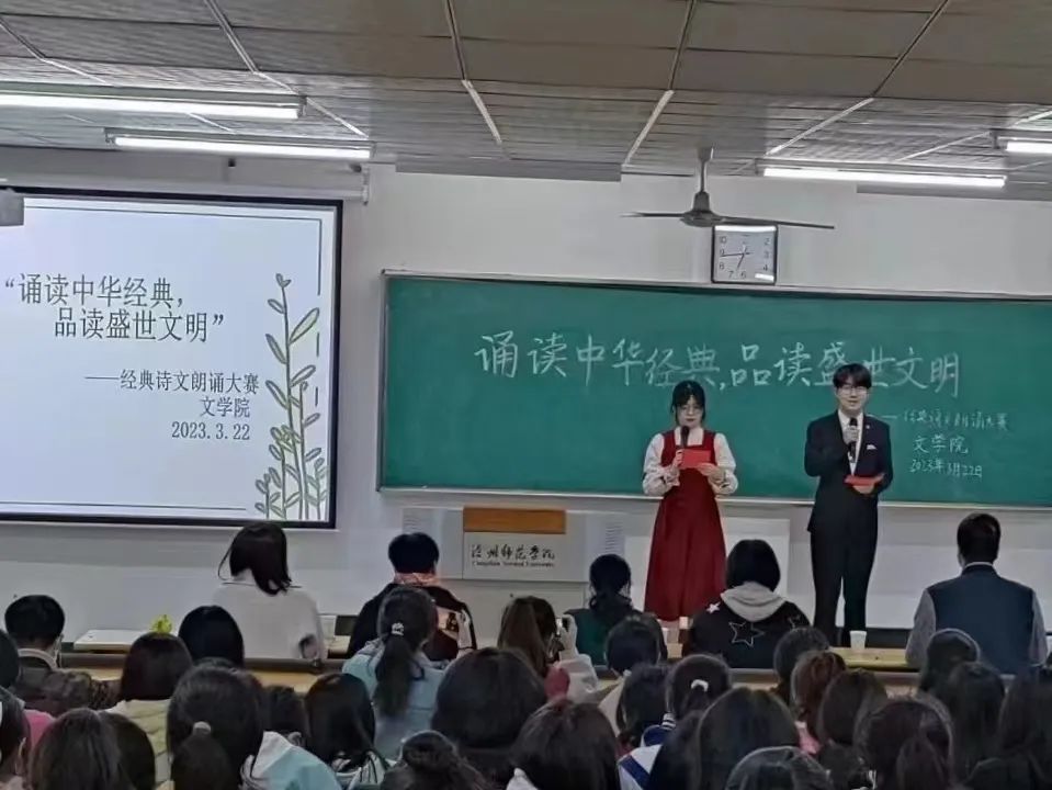 为加强师范生专业技能训练,传承中华优秀传统文化,推进文明校园建设,文学院组织举办“诵读中华经典 品读盛世文明”经典诗文朗诵大赛。近日,决赛于齐越楼二阶梯教室举行,文学院副院长程艳芳、党总支副书记高雪莲,语文课程教学知名专家王桂宏、教研室主任苏聪聪以及团总支书记孙玉安担任评委。经过激烈角逐,12名同学在决赛中获奖。