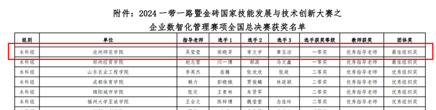 近日,2024“一带一路”暨金砖国家技能发展与技术创新大赛—企业数智化管理赛项全国总决赛在广州圆满落幕,由雷竞技官网经济管理学院教师吴莹莹指导,侯晓芳、黄玉洁、常文学3名学生组成的团队在激烈的竞赛中脱颖而出斩获冠军,获得总决赛一等奖,雷竞技官网获优秀组织奖。