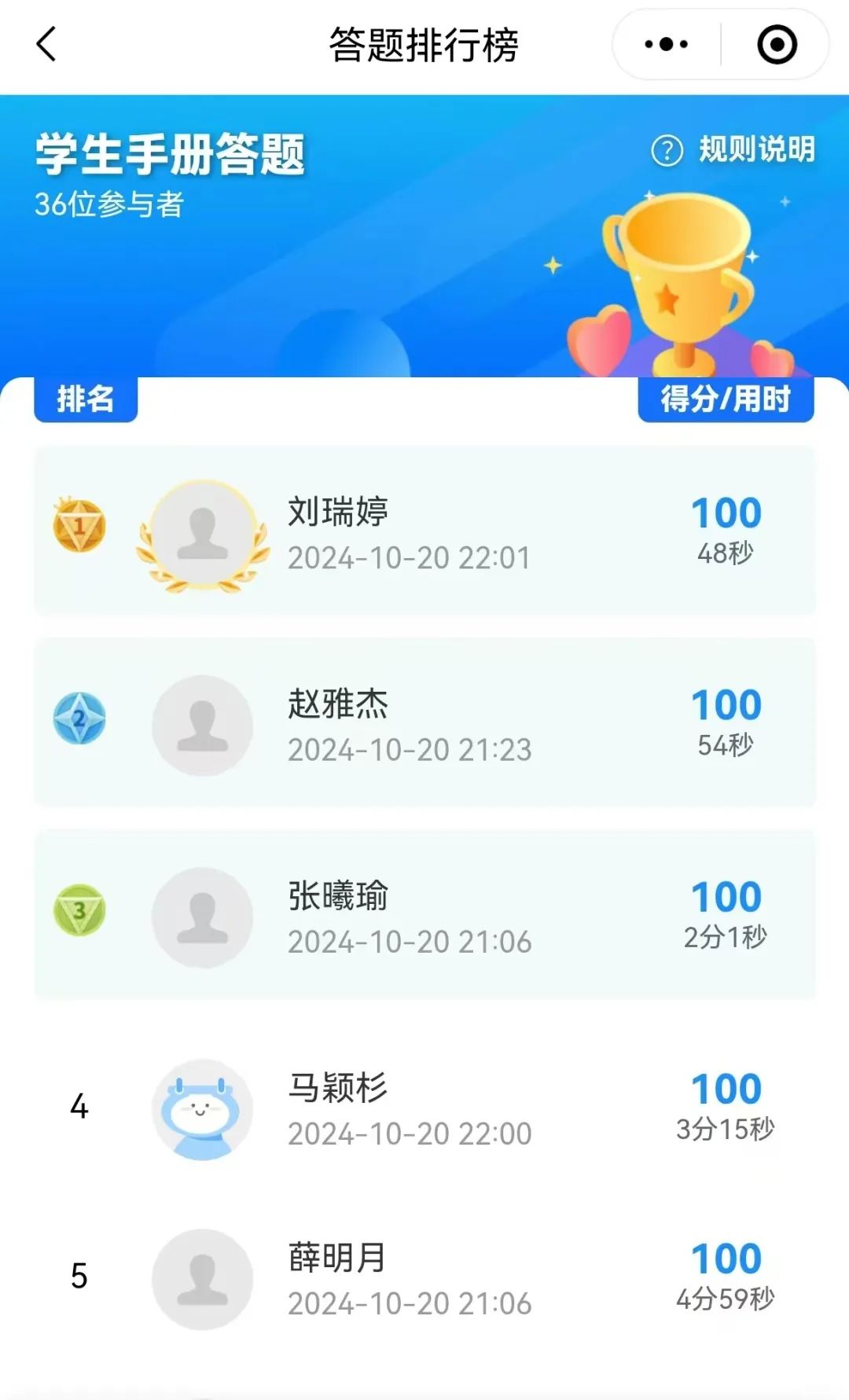 学生会针对2024级新生组织《学生手册》线上答题赛,通过知识竞答提升学生学习《学生手册》的兴趣和积极性,引导学生对所学内容进行回顾和巩固。